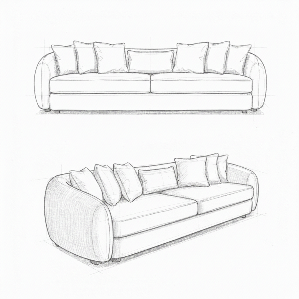 - Design: Features a heavy-set monolithic silhouette with deep, seamless curves and ultra-wide rounded armrests that flow into a continuous low-profile backrest.