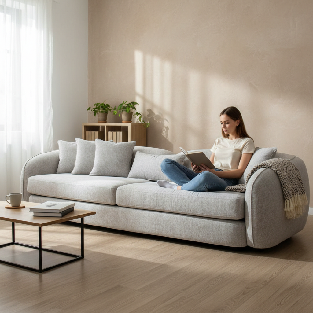 - Comfort Details: Equipped with a layered cushion system, including four large square back pillows and a central rectangular lumbar pillow, providing maximum depth and “sink-in” comfort.