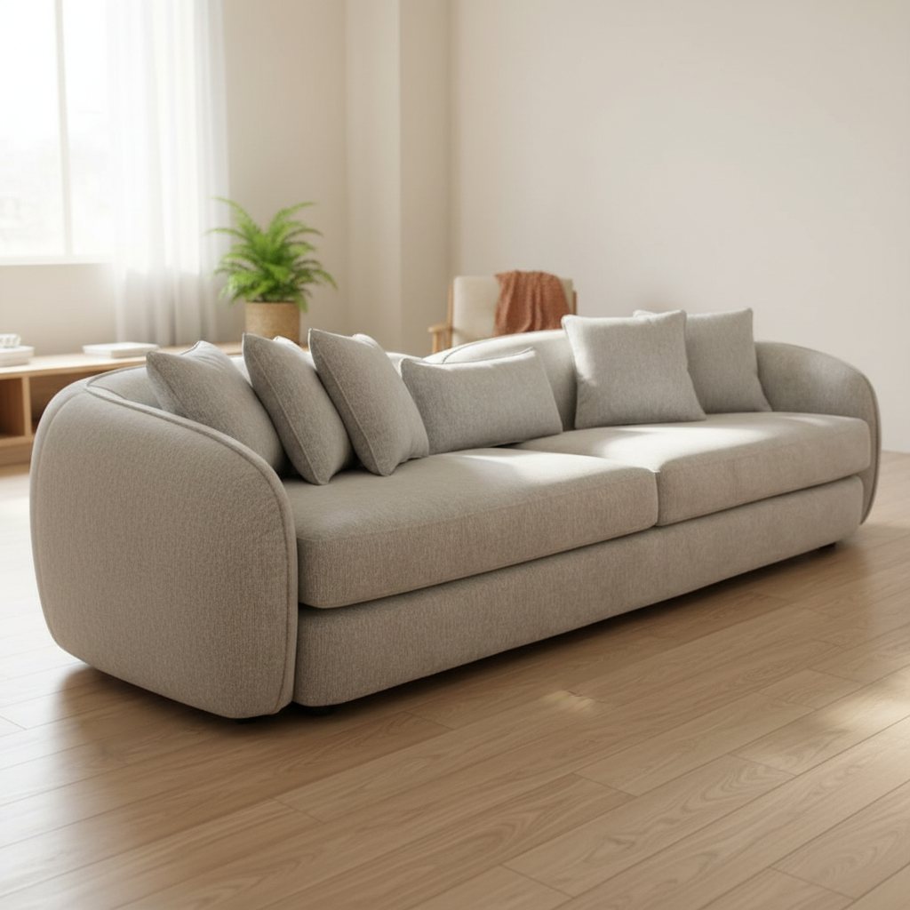 - Fabric: Upholstered in a premium sand-colored textured weave, offering a soft tactile finish and a neutral palette suitable for high-end organic modern interiors.