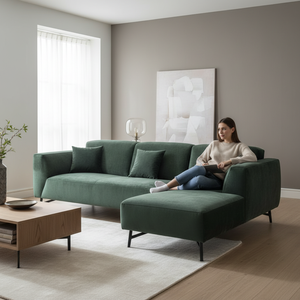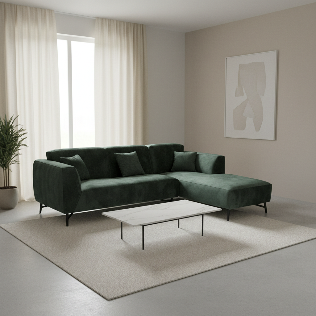 - Design: Features a sophisticated L-shape silhouette with a low-profile backrest and a fixed right-hand chaise, offering a bold, jewel-toned statement for upscale modern interiors.