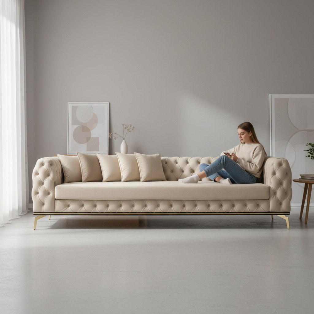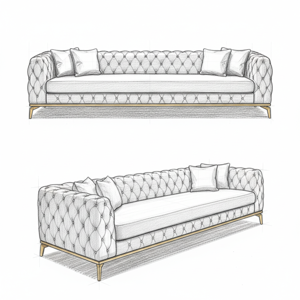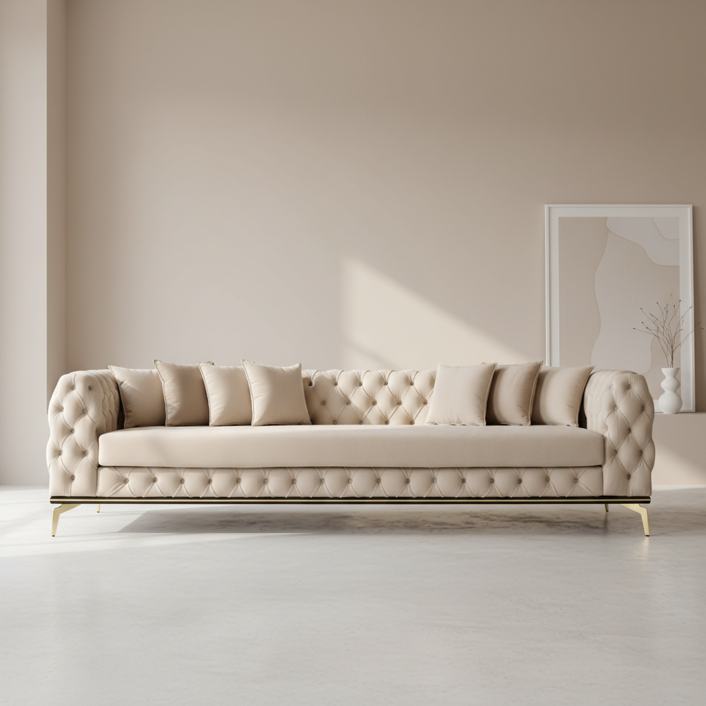 - Design: A contemporary reimagining of the classic Chesterfield design, featuring high-profile arms and back of equal height with deep, all-over button tufting (capitonné).