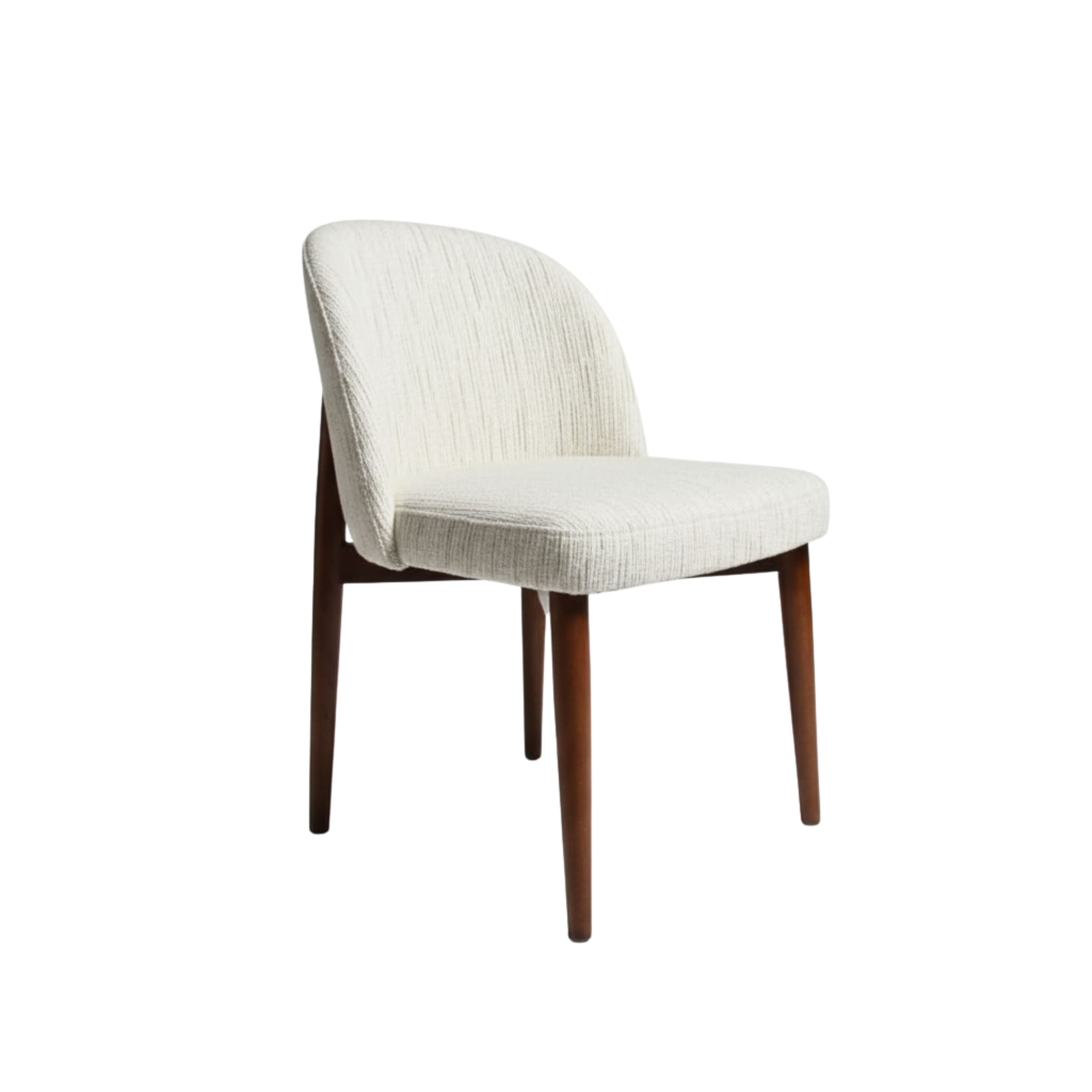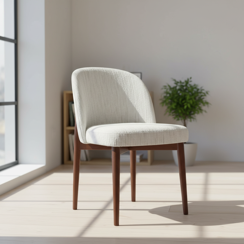 - A contemporary dining chair featuring a gently curved backrest and cushioned seat upholstered in soft off-white textured fabric with subtle vertical detailing.