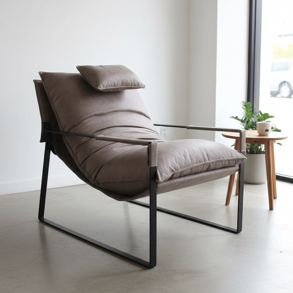 - A stylish contemporary lounge chair that combines deep comfort with a modern industrial aesthetic. It features a generously cushioned seat and a reclined backrest fully upholstered in soft brown fabric, complemented by a separate headrest cushion for enhanced relaxation. Subtle upholstery folds create a plush, inviting look.