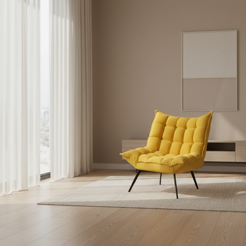 - A striking contemporary lounge chair featuring a high backrest and a deep, fully upholstered seat with a quilted tufted design that creates a plush and luxurious appearance. Upholstered in vibrant mustard yellow fabric, it adds warmth and a bold focal point to any interior.