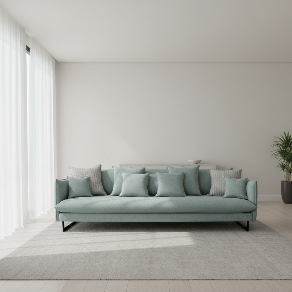 - Comfort Details: Features a seamless, deep-seated cushion design complemented by a balanced arrangement of plush toss pillows in matching seafoam and contrasting textured grey for superior lumbar support.