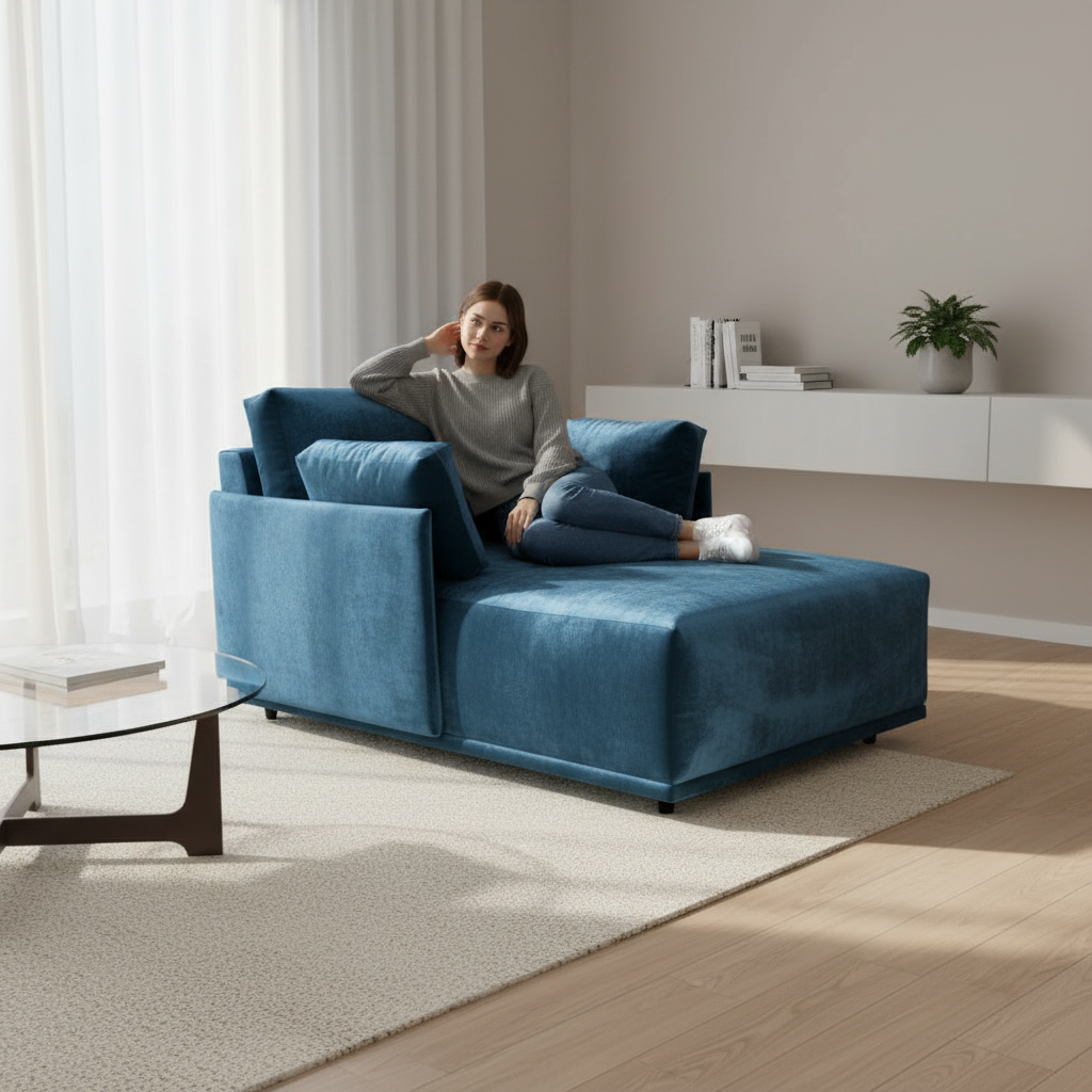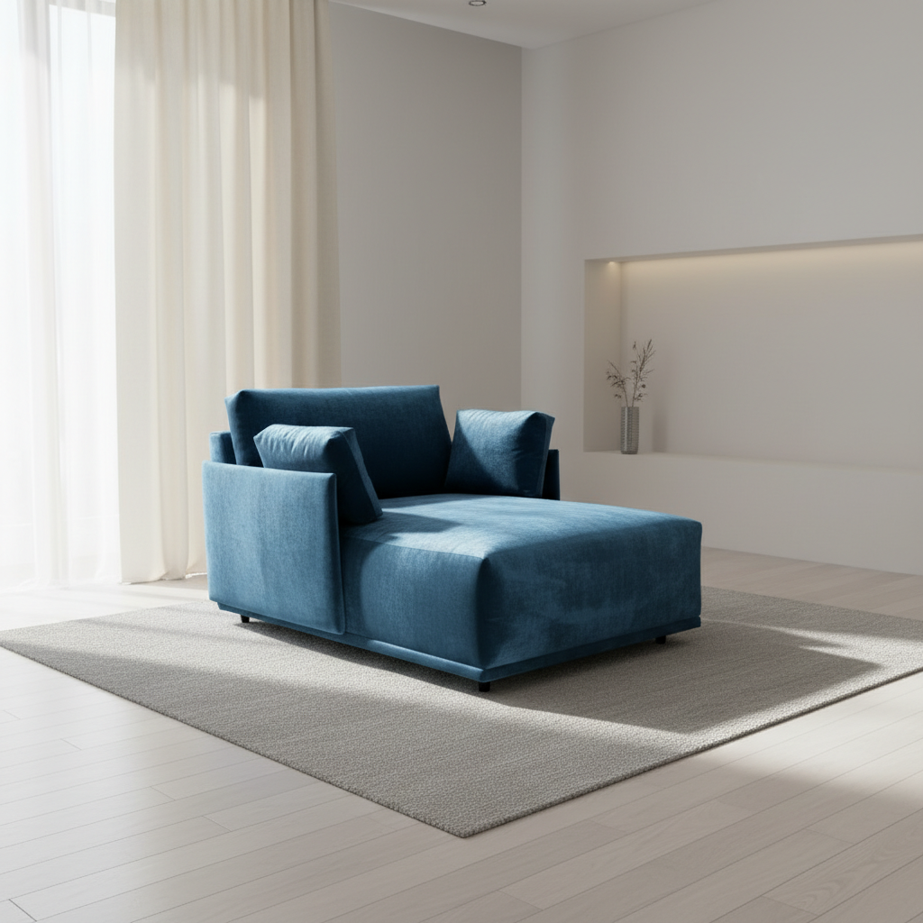 - Design: A luxury wide-profile chaise lounge featuring a modular, boxy silhouette with an integrated low backrest and a single structured armrest for a clean, modern aesthetic.