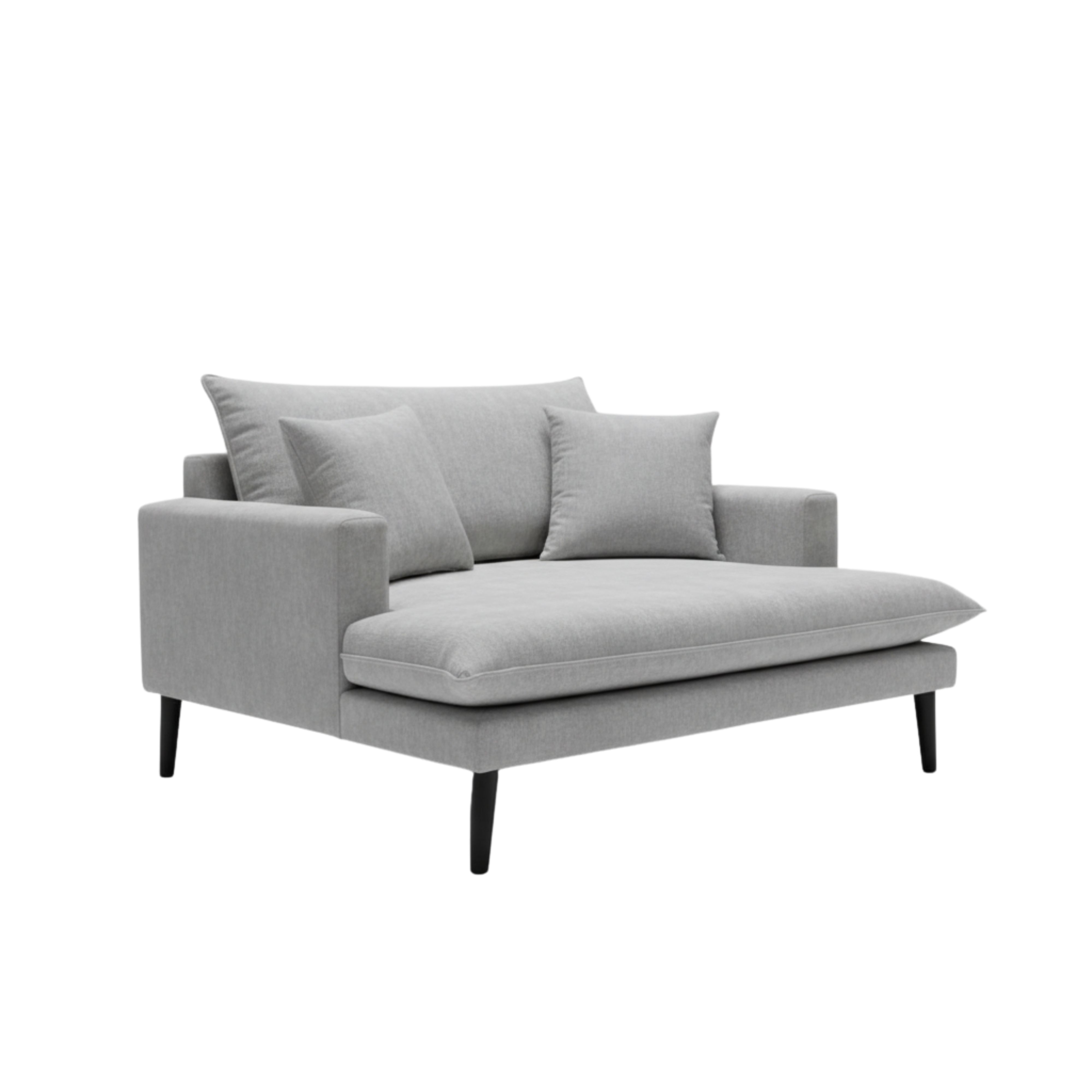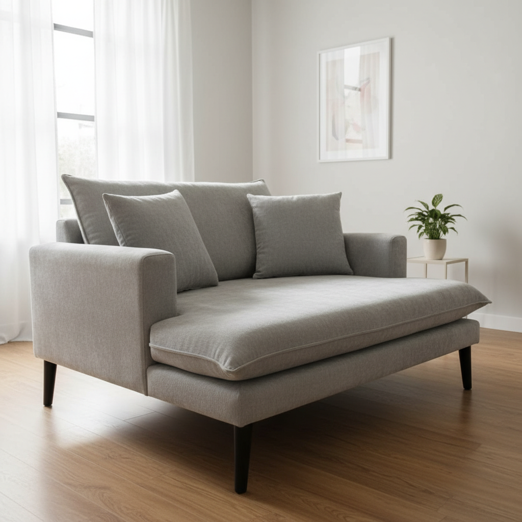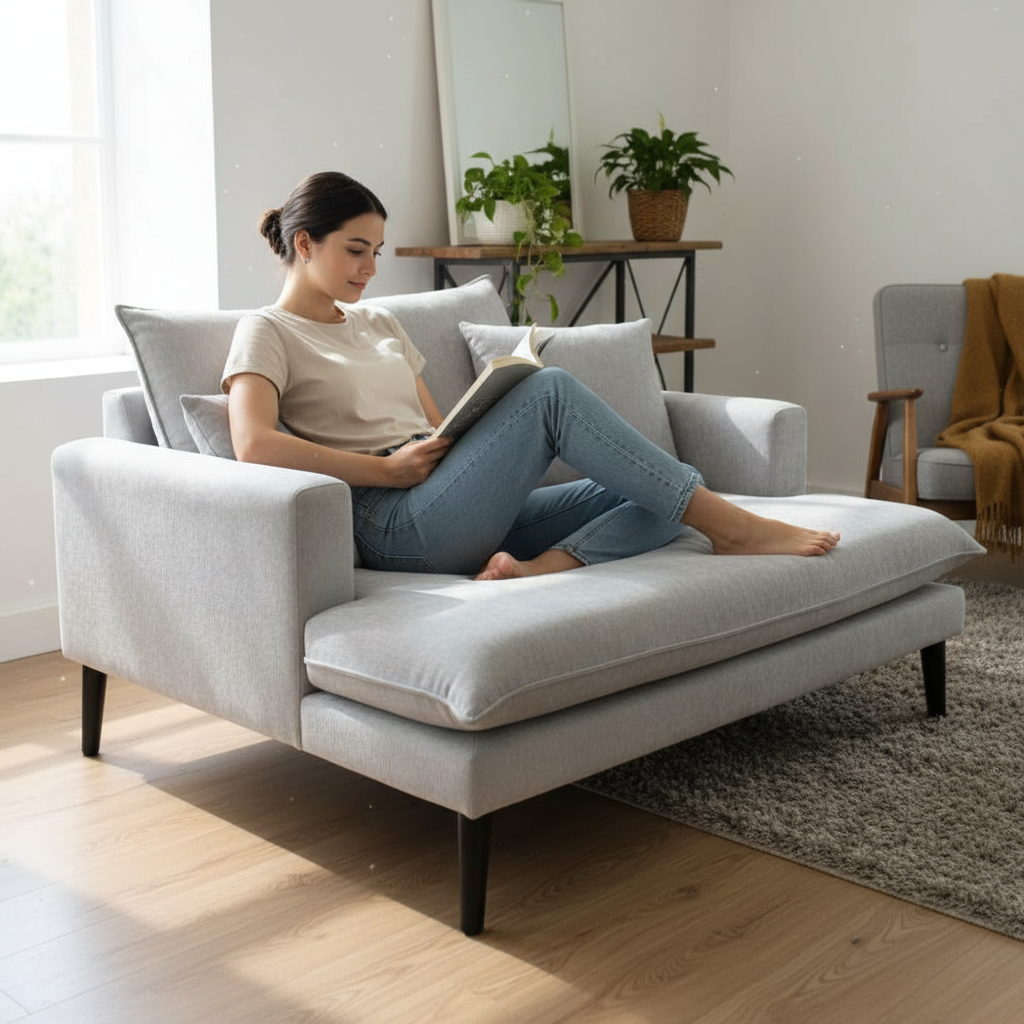 • Design: A generously proportioned oversized armchair or “cuddle chair” design, featuring a wide seat and low-profile track arms for a modern, airy feel.